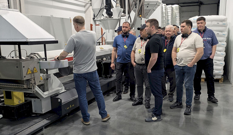 Вторым пунктом насыщенной экскурсионной программы стал завод по производству сеновязального шпагата KASMALAND. Гости узнали, какое сырье используется для производства, зачем добавляются специальные присадки, а также о ключевых эксплуатационных характеристиках шпагата KASMALAND.